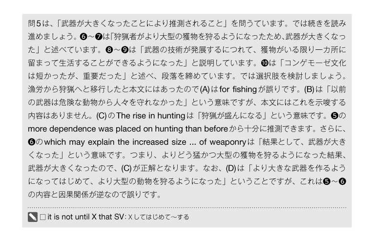 解説では、著者の頭の中ではどういったことが行われているのか解答プロセスを見ることができます。特にリーディングでは、設問がどのようなことを問うているのか、それに合わせ本文をどう読み進めていくのか、選択肢と本文をどのように比べて正解を導き出すのかがわかります。ここまで学習者目線に立った解説は非常にめずらしいです。