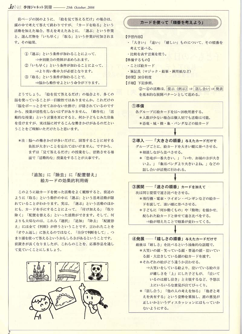 「学習意欲を起こさせる工夫」第3回応募作品 カードを使って「順番を考えよう」《並べ替える》で《考える》活動へ 地球っ子クラブ2000 講評 財団法人 波多野ファミリスクール 大蔵 守久