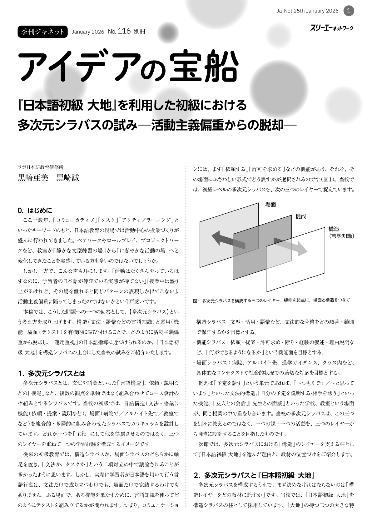 アイデアの宝船 『日本語初級 大地』を利用した初級における多次元シラバスの試み —活動主義偏重からの脱却— ラボ日本語教育研修所 黒崎亜美 黒崎誠